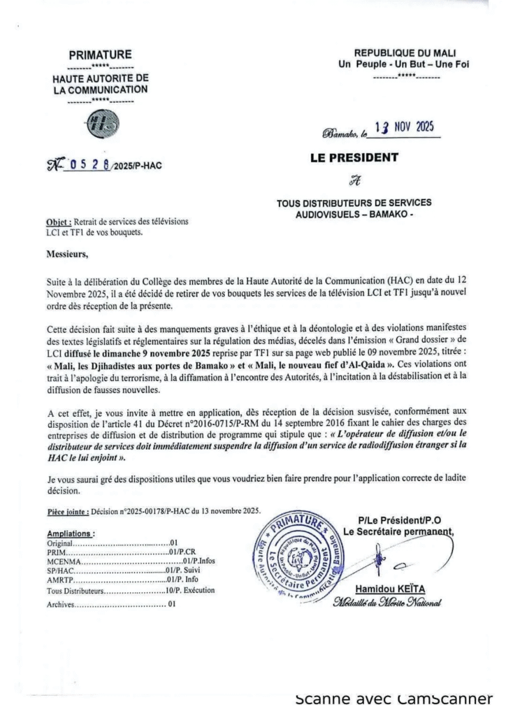 Dans un communiqué daté du 13 novembre 2025, la Haute Autorité de la Communication (HAC) a demandé à tous les distributeurs audiovisuels maliens de retirer LCI et TF1 de leurs bouquets. Cette mesure fait suite à l’émission « Grand dossier », diffusée le 9 novembre par LCI et relayée par TF1, présentant des titres tels que « Mali, les Djihadistes aux portes de Bamako » et « Mali, le nouveau fief d’Al-Qaïda ».