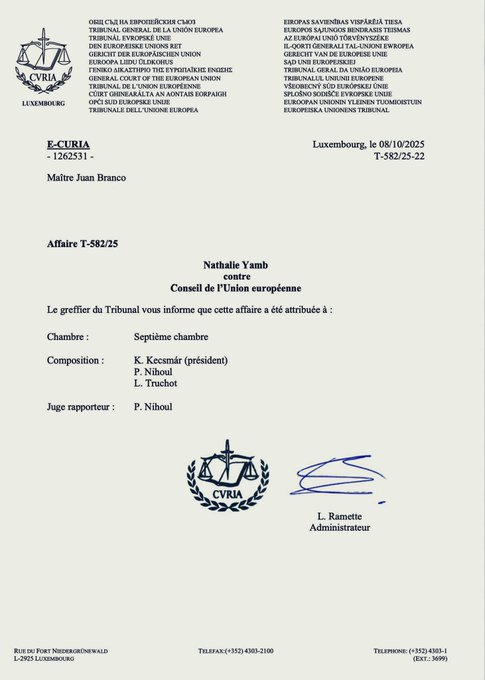 Le Tribunal général de l’Union européenne a officiellement enregistré le dossier sous la référence T-582/25, selon un document daté du 8 octobre 2025 et adressé à l’avocat de Nathalie Yamb, Maître Juan Branco.