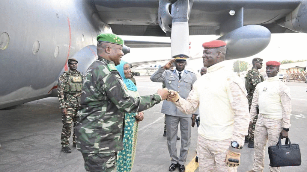 Le général Abdourahamane Tiani, président de la République du Niger, est arrivé à Ouagadougou le 30 septembre 2025, accompagné du ministre d’État, ministre de la Défense nationale, Salifou Mody, et de Salim Mahamadou Gado, directeur de cabinet adjoint. Ils ont été accueillis par le capitaine Ibrahim Traoré, président du Faso, lors d’une cérémonie officielle à l’aéroport international.